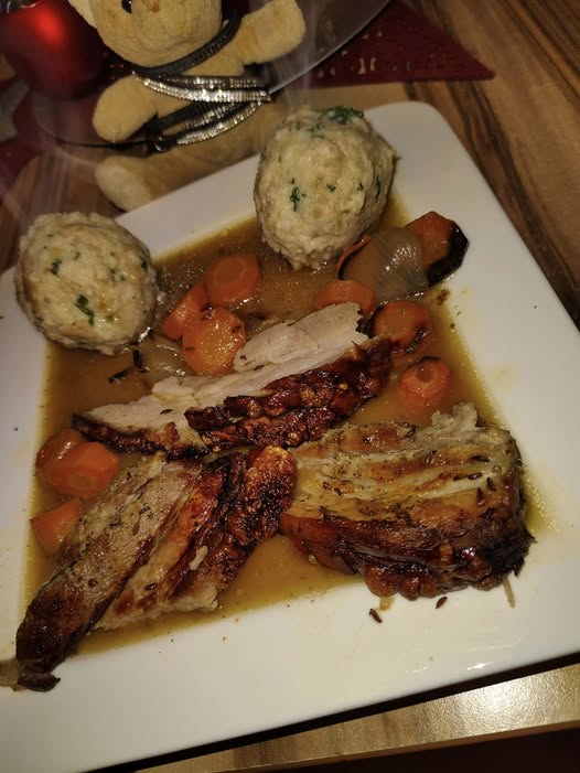 schweinsbauch mit Salz Pfeffer Knoblauch Kümmel und Majoran einreiben.