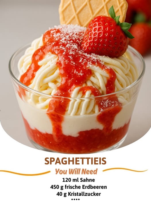 Spaghettieis bietet ein herrliches Zusammenspiel aus cremigem Vanilleeis, frischer Erdbeersauce und geriebener weißer Schokolade. Der Dessertklassiker entsteht, indem das Eis durch eine Kartoffelpresse in Form von Nudeln gepresst wird. Anschließend wird es mit Erdbeerpüree übergossen und mit feinen Schokoladeraspeln garniert. Servieren Sie es sofort für ein erfrischend süßes und optisch ansprechendes Dessert, das besonders im Sommer begeistert.