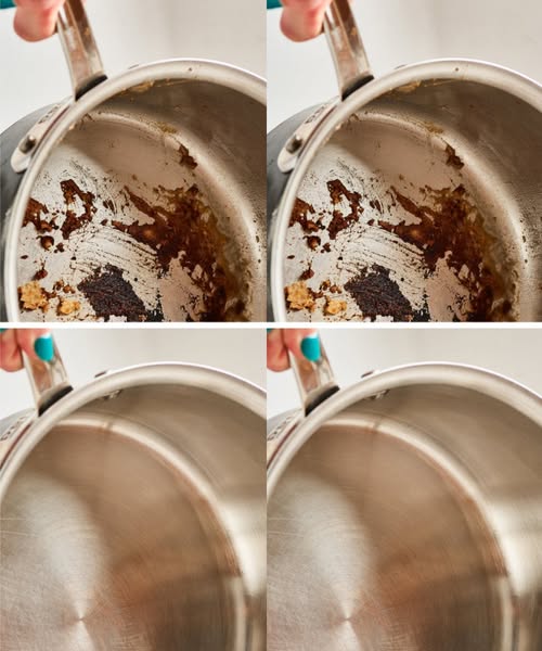 2. Mit Seife: Für Kochgeschirr aus Edelstahl oder Aluminium ist eine einfache Methode*: Geben Sie Seifenflocken auf den Boden, geben Sie heißes Wasser hinzu und kochen Sie es 20 Minuten lang. Anschließend gründlich mit einem Schwamm abwaschen.