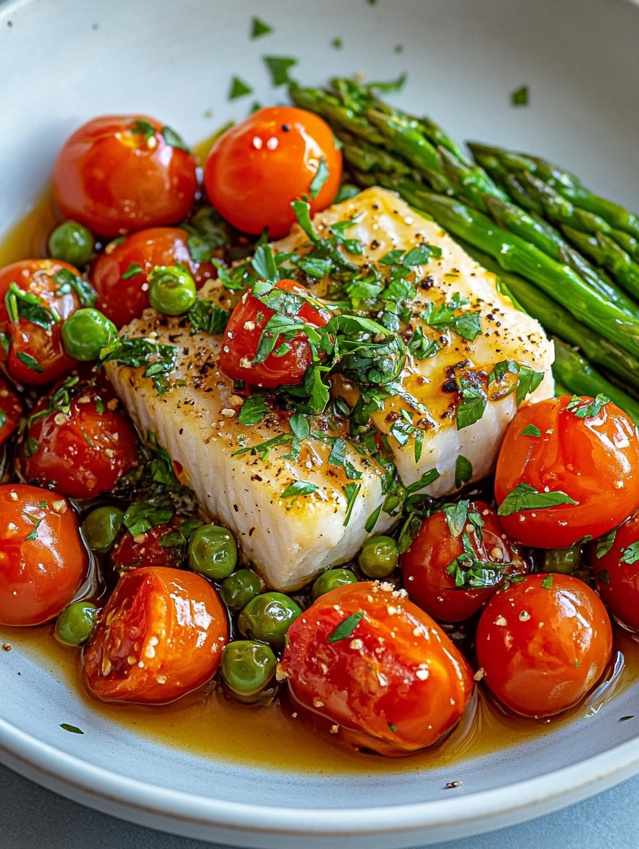 Ein aromatisches Ofengericht – zart gegarter Fisch mit mediterranem Gemüse, frischen Kräutern und einer extra Portion Frische durch grüne Erbsen!