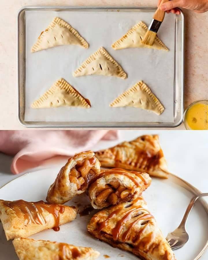 Blätterteigtaschen mit Karamell und Äpfeln sind die perfekte Mischung aus Blätterteig, warmen Äpfeln, Zimt und einem Hauch von Karamellsüße. Diese Taschen verleihen einem klassischen Dessert eine wohltuende und doch raffinierte Note und sind daher ideal für Familienfeiern, Festmahle oder auch als gemütlicher Leckerbissen an einem Herbstnachmittag. Der Kontrast zwischen den buttrigen, knusprigen Blätterteigschichten und der weichen, würzigen Apfelfüllung macht jeden Bissen zu einem Genuss. Durch die Kombination von gekauftem oder selbstgemachtem Blätterteig mit einer einfachen Füllung schafft dieses Rezept die perfekte Balance zwischen Bequemlichkeit und Gourmet-Appeal. Das optionale Salzkaramell sorgt für eine zusätzliche Schicht Dekadenz und unterstreicht die Süße der Äpfel mit einer herrlich herzhaften Note. Mit minimaler Vorbereitungszeit sind diese Taschen ein zeitloses Dessert, das nahtlos zu jedem Anlass passt, Gäste beeindruckt und Heißhunger auf Süßes mühelos stillt.