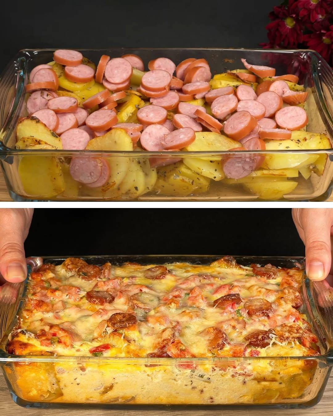 Dieser Kartoffel-Wurst-Auflauf ist ein herzhaftes, aromatisches Gericht, perfekt für ein sättigendes Abendessen. Die Kombination aus zarten Kartoffeln, herzhaften Jagdwürsten und cremiger Sauerrahm ergibt ein unwiderstehliches Gericht. Ergänzt durch einen erfrischenden Dill-Gurken-Salat entsteht ein ausgewogenes, köstliches Erlebnis. So geht’s Schritt für Schritt: