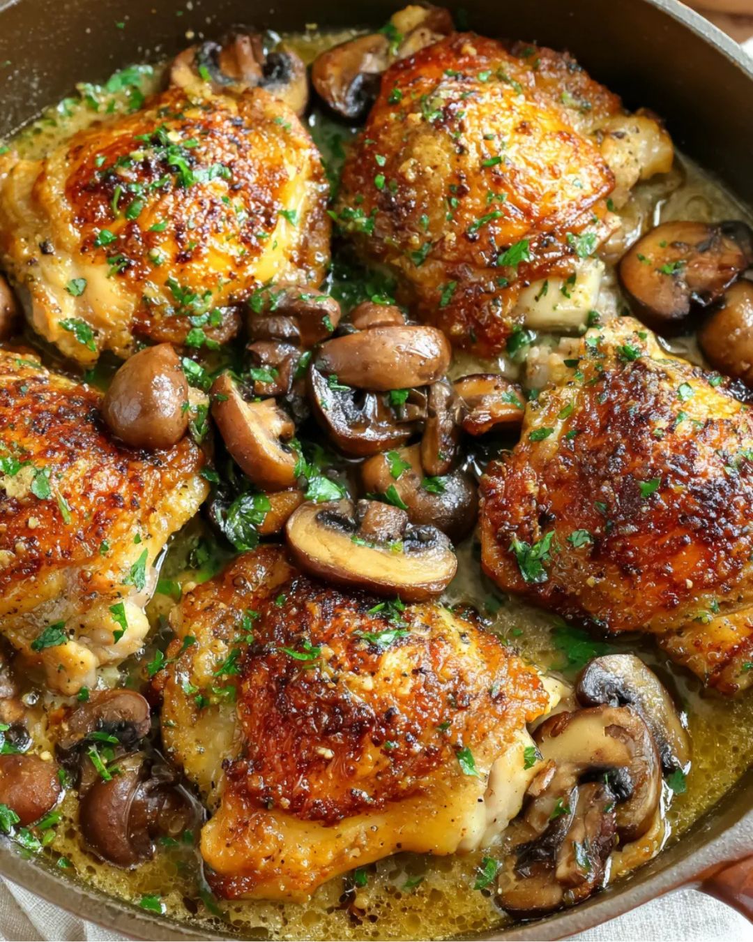 Zarte Hähnchenschenkel werden mit aromatischen Gewürzen goldbraun angebraten und bleiben herrlich saftig. Frische Champignons garen in geschmolzener Butter, vereint mit fein gehacktem Knoblauch für eine extra Portion Geschmack. Das Ganze wird in nur einer Pfanne zubereitet. Nach kurzem Schmoren ziehen Chicken Thighs alle Aromen auf und werden mit frischer Petersilie vollendet. Ideal in nur 30 Minuten als leckeres, ausgewogenes Abendessen, das immer gut ankommt.