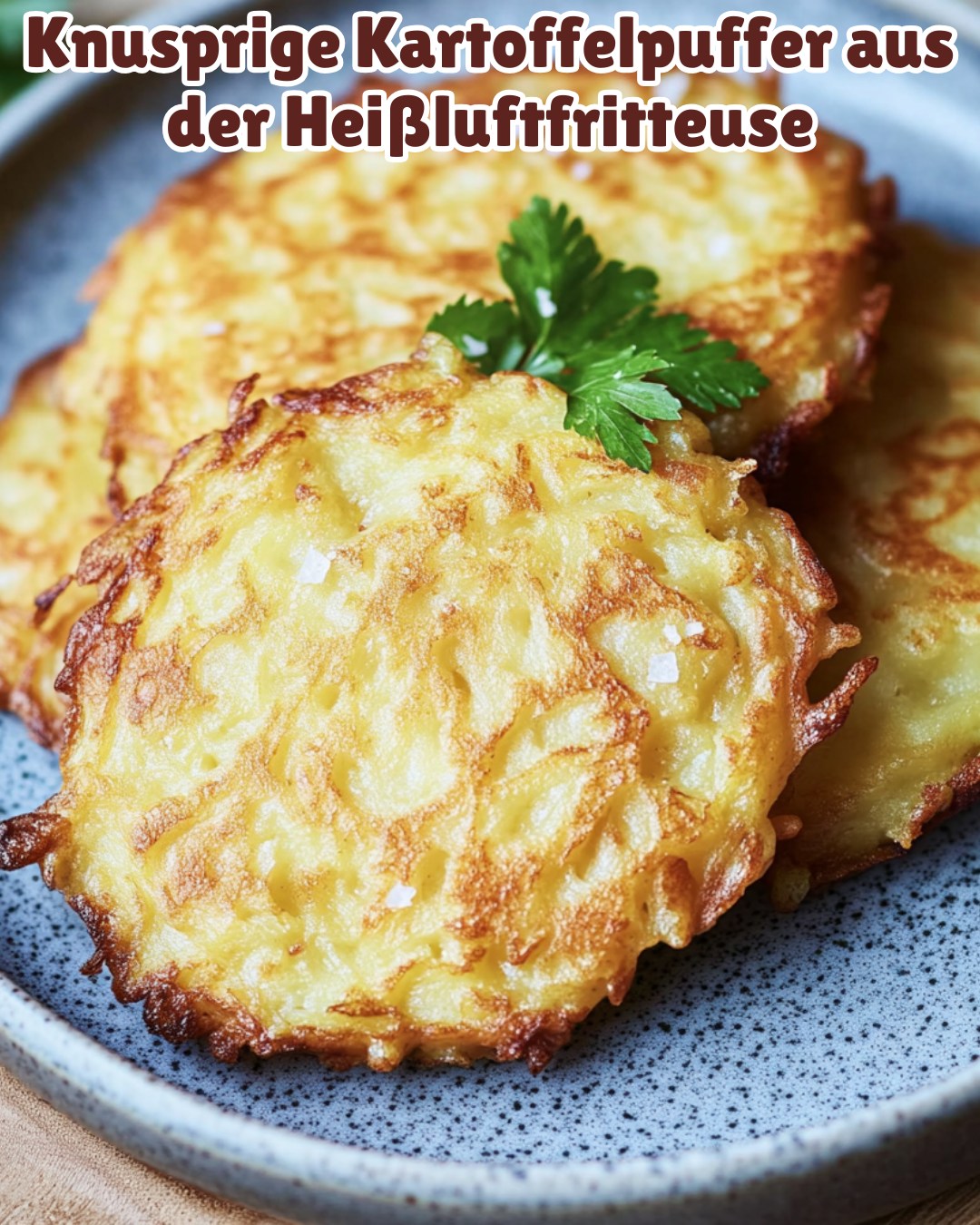 Diese knusprigen Kartoffelpuffer werden mit wenig Öl in der Heißluftfritteuse zubereitet – perfekt als Snack oder Beilage!