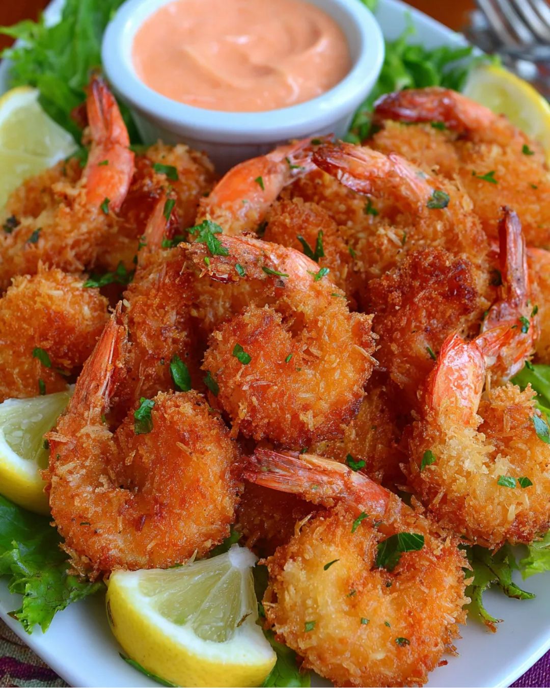 Knusprige Garnelen in einer goldbraunen Kokos-Panko-Kruste bieten wunderbare Aromen: Die natürliche Süße der Kokosflocken harmoniert mit mildem Paprika, würzigem Knoblauch und zarten Shrimps. Nach dem Wenden in einer leichten Mischung aus Ei und Kokosmilch werden die Garnelen frittiergold serviert und auf Küchenpapier abgetropft. Ein würziger, cremiger Dip aus Sriracha, Mayo und Limettensaft rundet das Gericht hervorragend ab. Perfekt als Snack, Vorspeise oder festliches Fingerfood. Genieße das Spiel aus Knusprigkeit und saftigem Meeresgeschmack.