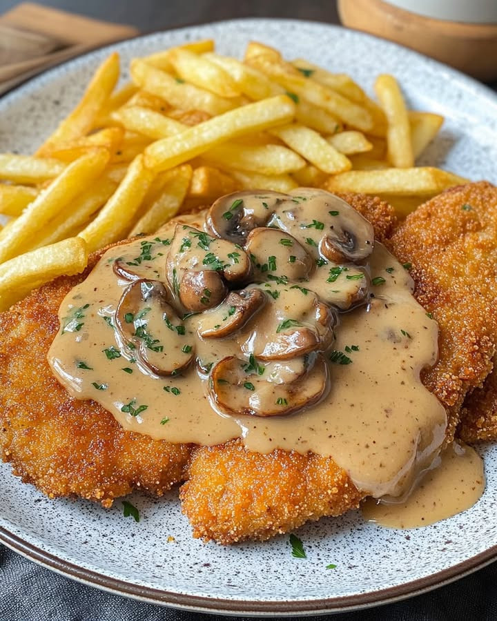 Knuspriges Jägerschnitzel mit cremiger Jägersoße und Pommes