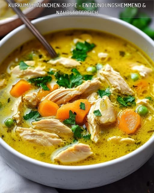 Diese wohltuende Kurkuma-Hähnchen-Suppe, gefüllt mit Gemüse und aromatischen Gewürzen, ist perfekt für kalte Tage und zur Stärkung des Immunsystems.