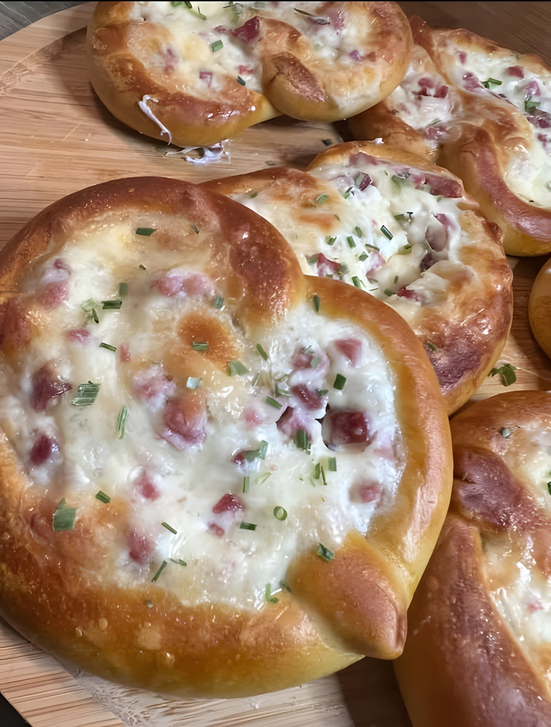 Laugenbrezel mit Schmand, Schinkenwürfel, Käse