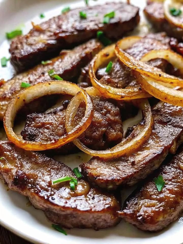 600 g Rinderleber (in Scheiben geschnitten), 3 große Zwiebeln (in Ringe geschnitten), 3 EL Mehl, 50 g Butter oder Schmalz, 100 ml Fleischbrühe (optional), Salz und Pfeffer nach Geschmack, 1 Prise Zucker, Etwas Petersilie zum Garnieren
