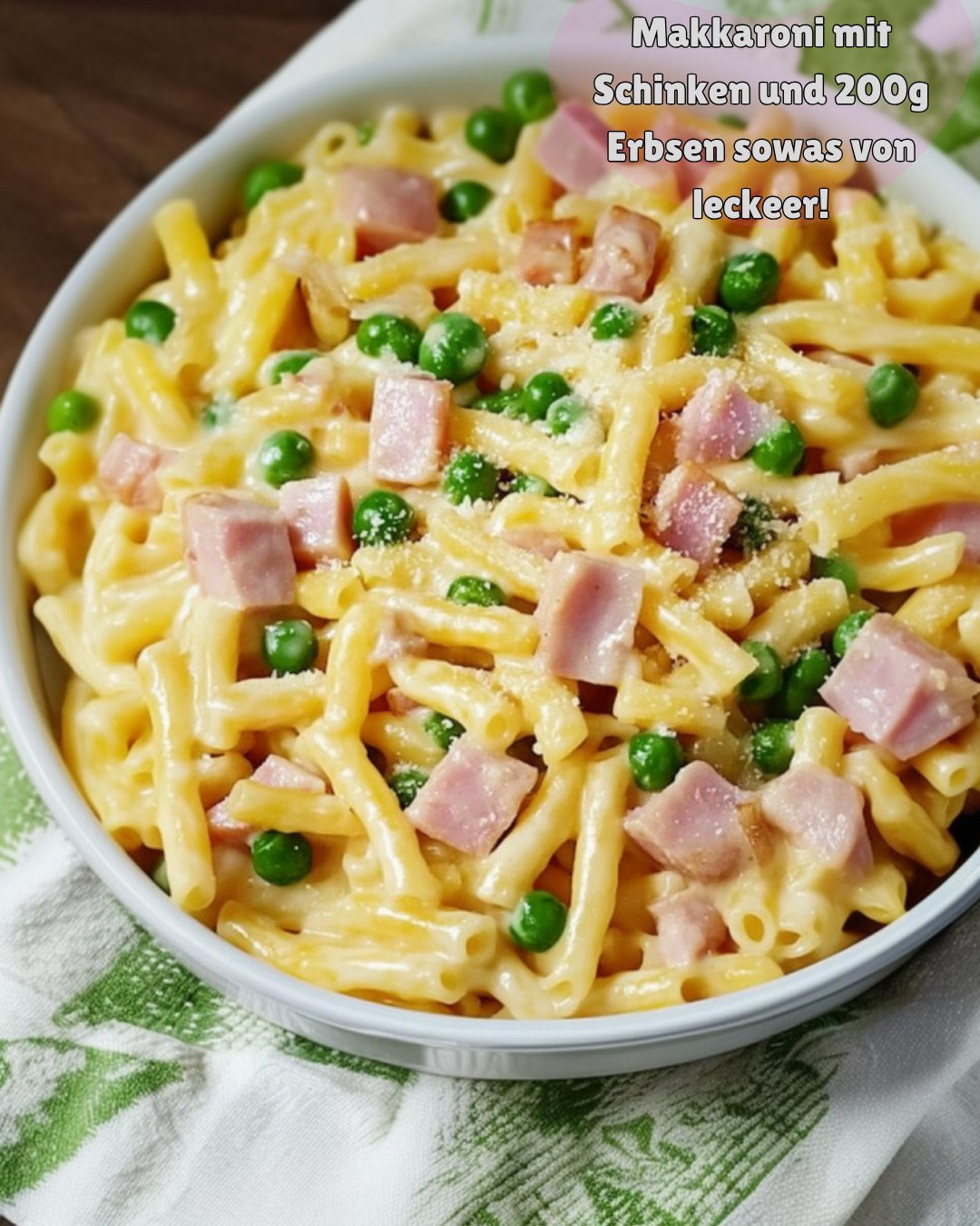 Diese Makkaroni mit Schinken, Erbsen und einer cremigen Sahnesauce sind das perfekte schnelle Abendessen für die ganze Familie.