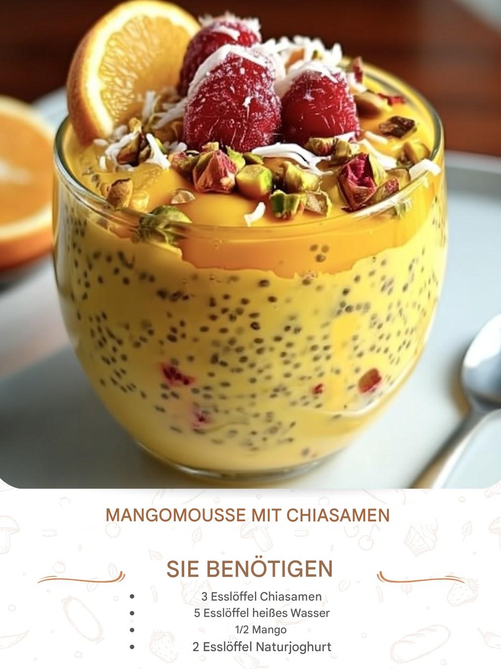 MANGOMOUSSE MIT CHIASAMEN Ein gesunder und leckerer Snack! ZUTATEN: 3 EL Chiasamen 5 EL heißes Wasser 1/2 Mango 2 EL Naturjoghurt 1/2 TL Honig 1 TL Kokosflocken Ein paar gefrorene Himbeeren (optional) 3 Pistazien (optional) ZUBEREITUNG:![]()