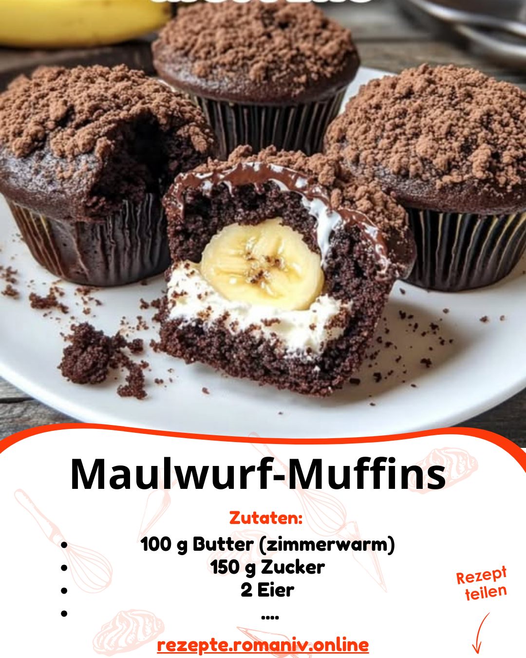 Diese köstlichen Maulwurf-Muffins sind eine traumhafte Kombination aus schokoladigem Muffinboden, fruchtiger Bananenfüllung und luftiger Sahnehaube. Sie sind nicht nur ein echter Hingucker, sondern auch der perfekte Snack für zwischendurch oder die nächste Kaffeetafel.