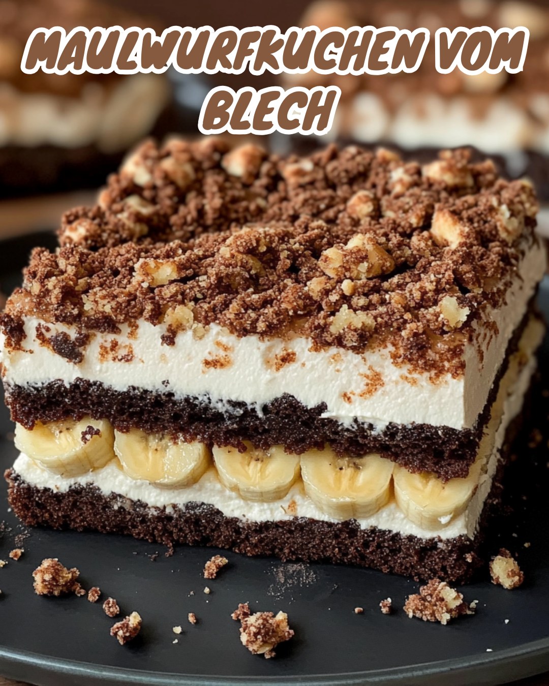 Kurzbeschreibung: Saftiger Schokoteig, cremige Füllung, Bananenund knusprige Krümel – perfekt für jede Gelegenheit!