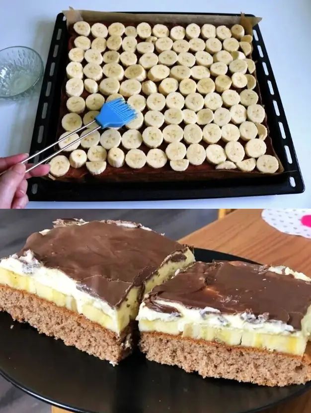 Ein besonders saftiger Kuchen mit Vanillepudding, frischen Bananen und einer glänzenden Schokoladenglasur – ideal für Geburtstage, Feste oder als süße Belohnung für Zwischendurch.