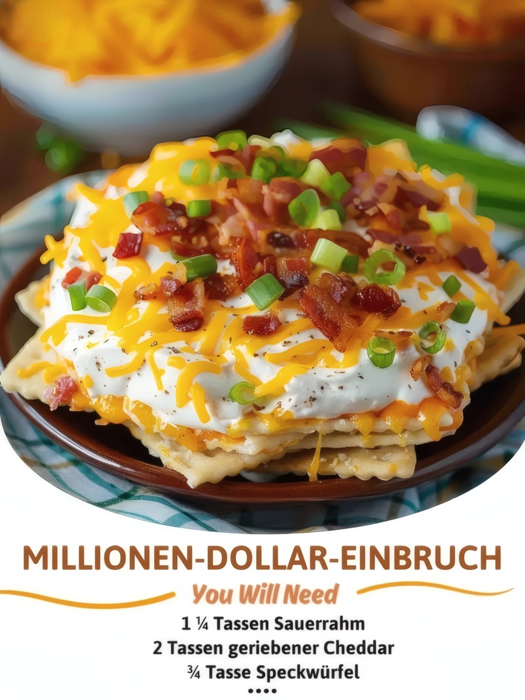 Dieser Million-Dollar-Dip bringt Genuss auf höchstem Niveau. Kombiniert werden Frischkäse, Sauerrahm, würziger Cheddar, knuspriger Speck und eine Prise Knoblauchpulver. Verfeinert mit frisch geschnittenen Frühlingszwiebeln entsteht ein cremiger, aromatischer Dip, der perfekt mit Crackern oder Chips harmoniert. Schnell zubereitet und ideal für Partys oder als Snack zwischendurch – dieser Dip sorgt immer für Begeisterung!