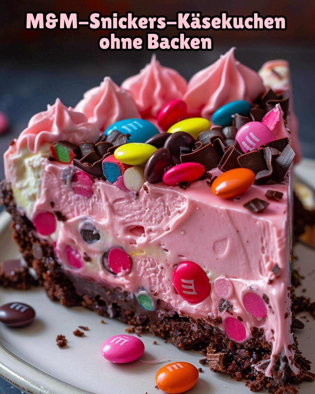 Ein bunter und cremiger No-Bake-Käsekuchen, gefüllt mit Snickers und M&Ms, perfekt für jede Feier!