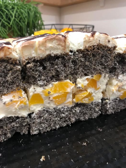 Die perfekte Kombination aus lockerem Mohnbiskuit und Pfirsichcreme – ein Dessert, das jeden begeistert! 🍰