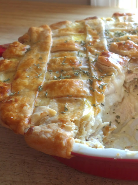 So, ich zeige euch jetzt meine Chicken Pie. Keine Chicken Pot Pie, sondern einfach nur Chicken Pie. Karotten? Nö. Sellerie? Nö. Gemüse? Nein, nicht so. Es ist eine einfache Chicken Pie ohne Gemüse. Nur Hühnchen. Jede Menge Hühnchen und eine dicke, cremige Sauce, die man am liebsten mit einem Strohhalm trinken würde! Und ein Pie-Boden, der so buttrig ist, dass er auf der Zunge zergeht. Eine doppelte Schicht Pie-Boden. Oh mein Gott, das ist so lecker.