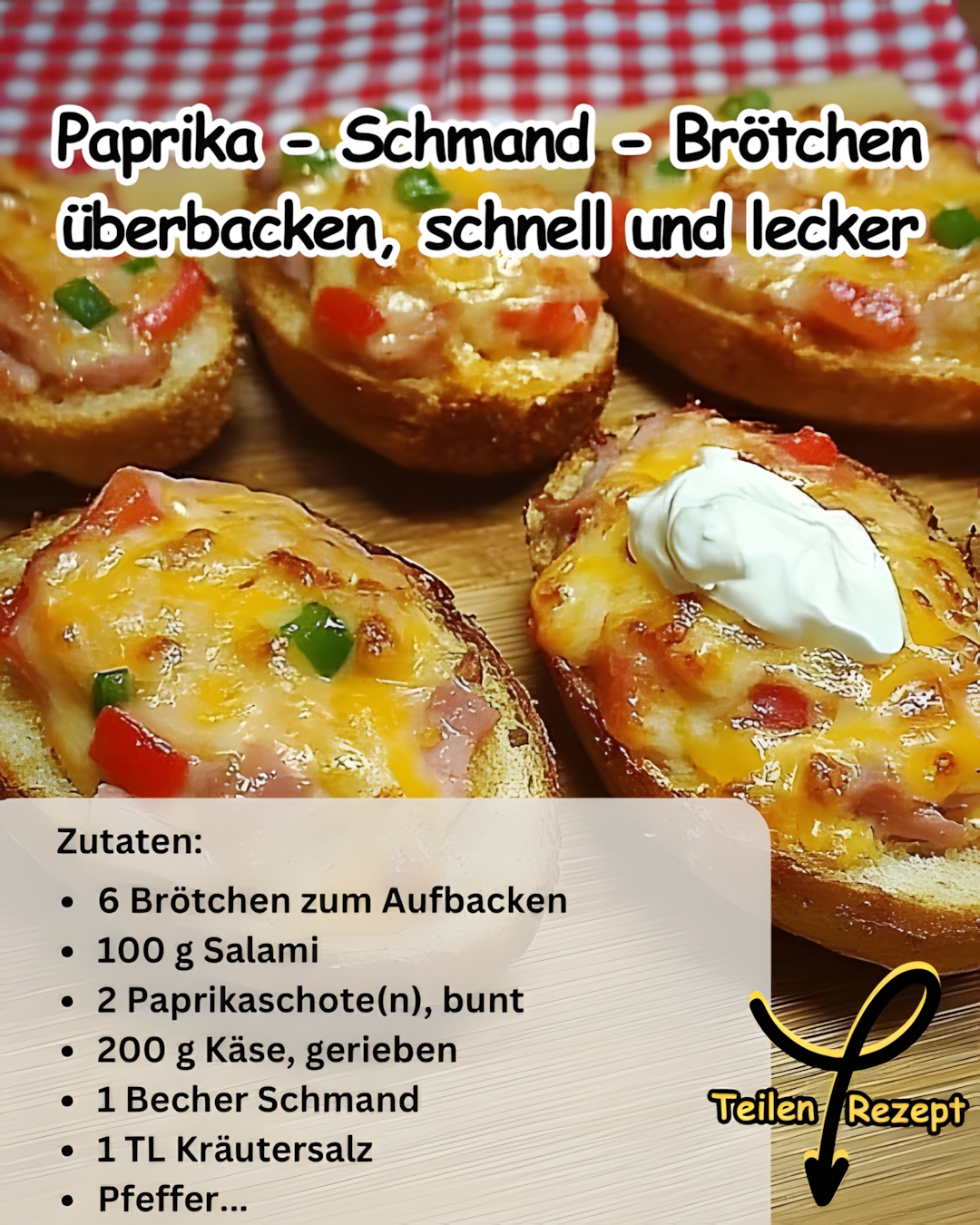 Paprika – Schmand – Brötchen überbacken, schnell und lecker June 20, 2025 by articles auch für den Thermomix Zutaten: 6 Brötchen zum Aufbacken 100 g Salami 2 Paprikaschote(n), bunt 200 g Käse, gerieben 1 Becher Schmand 1 TL Kräutersalz Pfeffer evtl. Chilipulver oder Tabasco ZuberWeiche Wenn du weiterlesen möchtest, klicke auf “Nächste→” ⬇️⬇️ Nächste→ Leave a Comment Cancel replyCommentName Email Website Save my name, email, and website in this browser for the next time I comment.