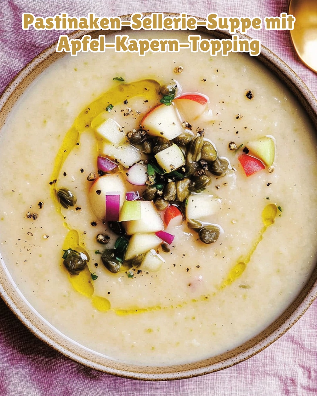 Pastinaken-Sellerie-Suppe mit Apfel-Kapern-Topping