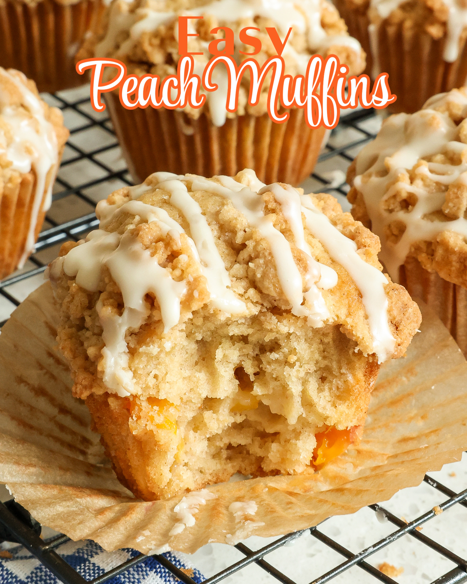Diese Pfirsichmuffins im Bäckerei-Stil haben zartschmelzende Streusel und einen Ahorn-Vanille-Topping. Backen Sie diese Muffins mit frischen oder gefrorenen Pfirsichen und genießen Sie ein schnelles Frühstück oder einen Snack für unterwegs mit viel Pfirsichgeschmack.