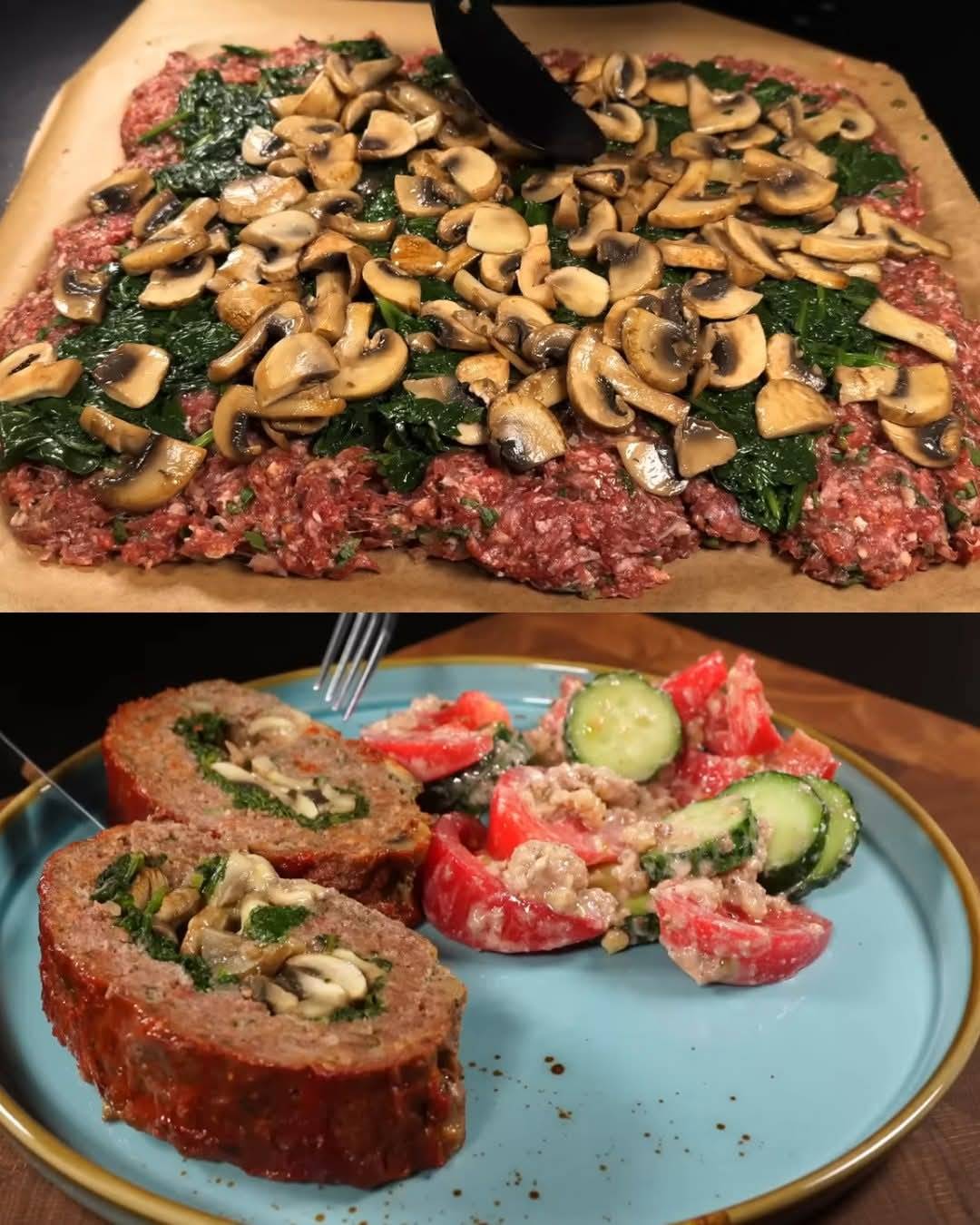Dieser herzhafte Hackbraten besticht durch seine Kombination aus Hackfleisch, Spinat, Pilzen und einer reichhaltigen Honig-Senf-Sauce durch seinen intensiven Geschmack und seine Textur. Er ist das perfekte Gericht für ein Familienessen oder einen besonderen Anlass und bietet eine herzhafte Füllung mit einer würzigen, leicht süßen Glasur. Der geschmolzene Käse und die knackigen Walnüsse obendrauf sorgen für zusätzliche Fülle, während Gemüse und Gewürze dem Fleisch Tiefe und aromatischen Geschmack verleihen. Zusammen mit einem einfachen Salat aus Gurken, Tomaten und einem pikanten Dressing ist dieses Gericht herzhaft und sättigend zugleich.