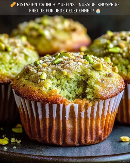 Diese saftigen Pistazienmuffins mit knackigem Topping aus gehackten Pistazien und Zucker sind perfekt für den kleinen Hunger – ideal zum Frühstück oder als Snack.