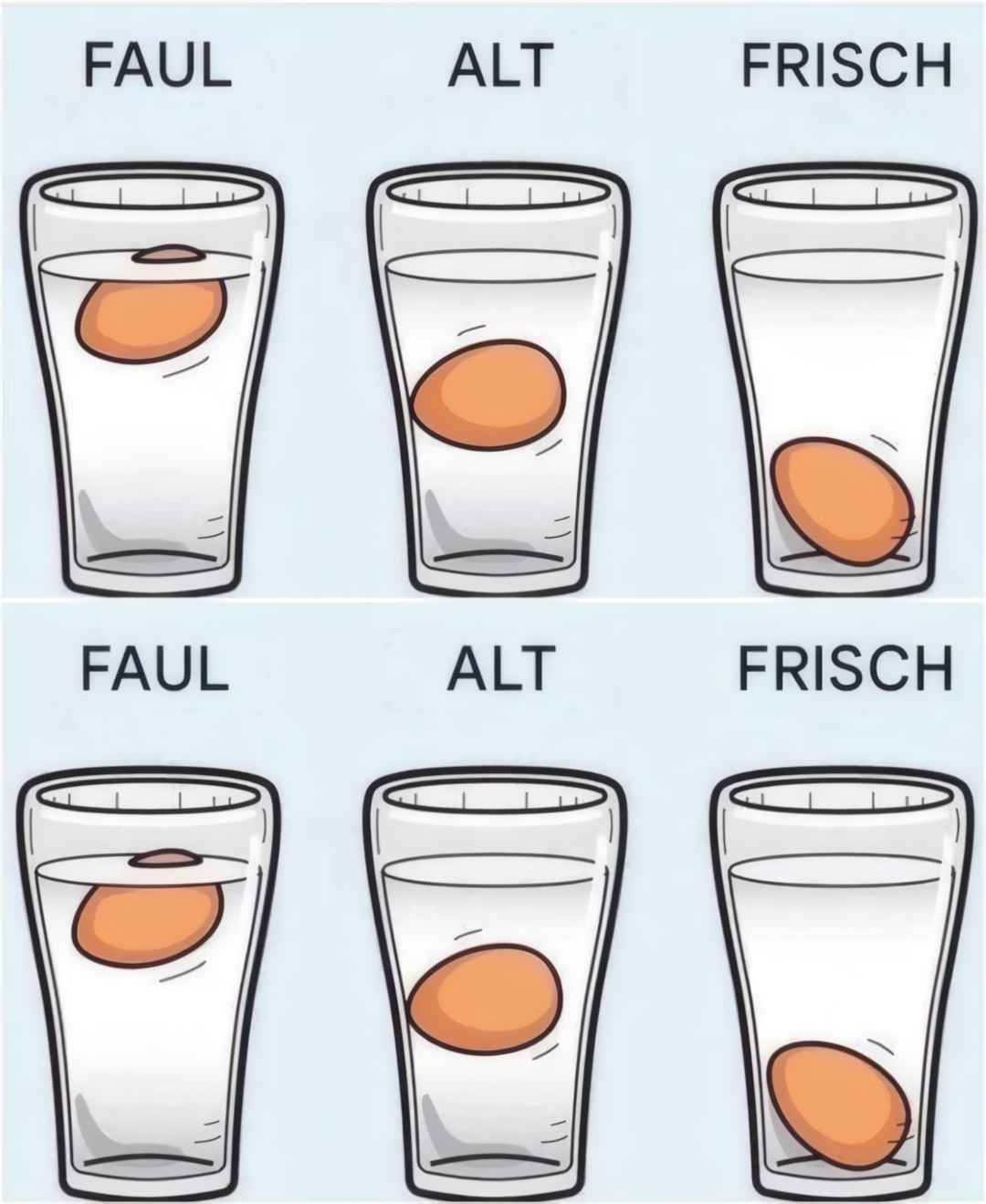 Weniger frische Eier: Wenn das Ei den Boden nur schräg berührt oder leicht ansteigt, ist es nicht mehr ganz frisch, aber dennoch sicher zu konsumieren. Solche Eier sollten jedoch nicht roh verzehrt werden, sondern eignen sich besser zum Kochen oder Braten, zum Beispiel für Rührei oder hartgekochte Eier.