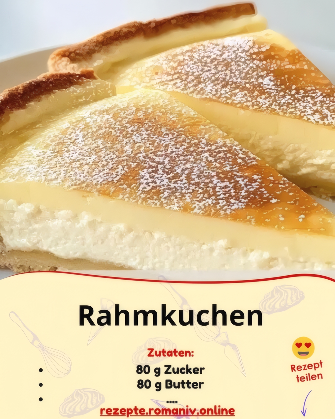 Ein herrlich cremiger Rahmkuchen mit einem knusprigen Mürbeteigboden und einem intensiven Sahnebelag, der einfach schmilzt! Perfekt für ein gemütliches Kaffeekränzchen oder als leckeres Dessert.