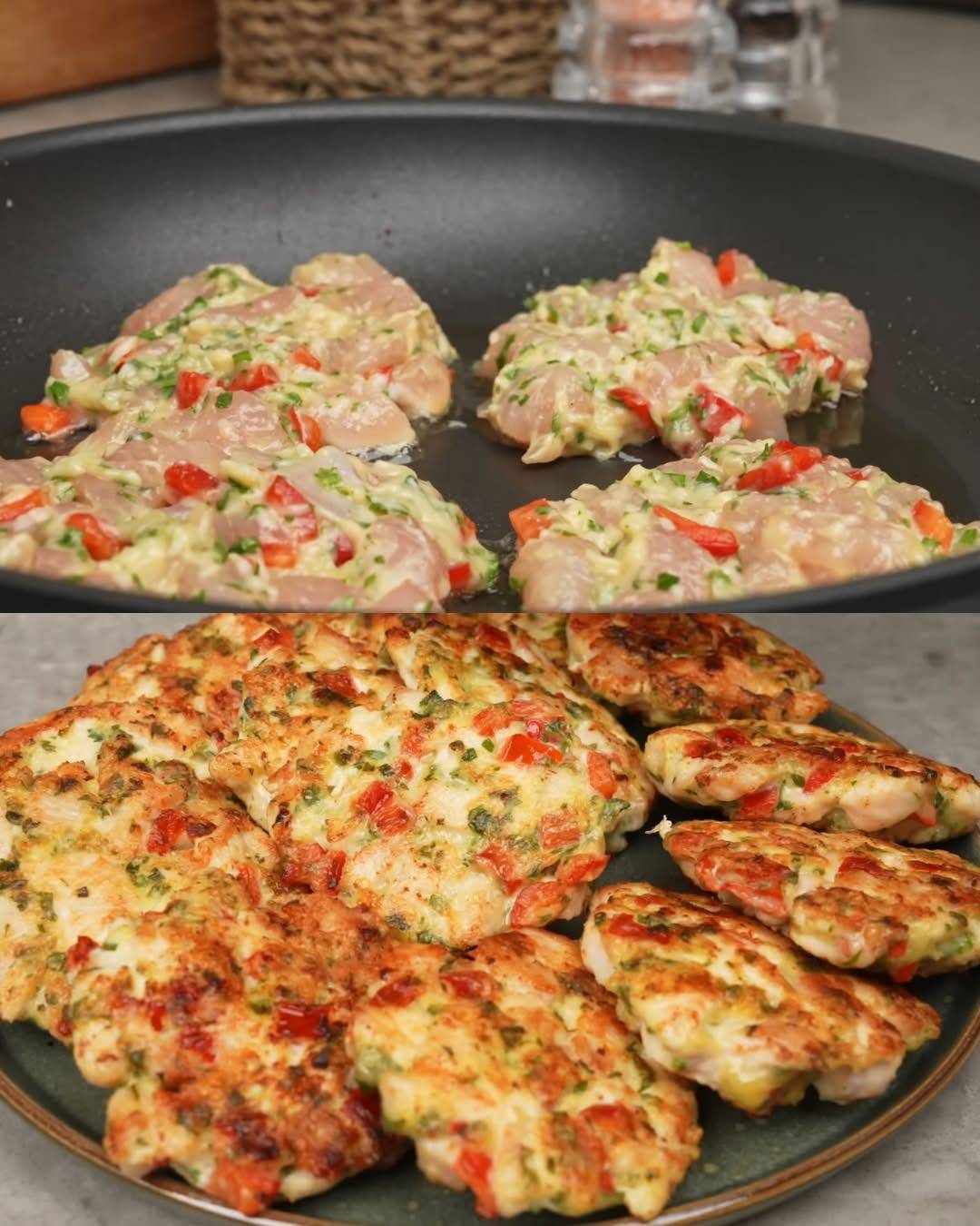 Dieses einfache Hühnchenrezept ist eine schnelle und leckere Mahlzeit, perfekt für jeden Tag. Die Hähnchenfilets werden fein gehackt, mit Salz und Pfeffer gewürzt und anschließend goldbraun und knusprig gebraten. Die cremige Sauce aus Sauerrahm, Knoblauch, frischen Kräutern und Tomaten verleiht dem Gericht einen reichhaltigen und aromatischen Touch. Dieses Gericht ist ein wahrer Gaumenschmaus und lässt sich dank der minimalen Zubereitungszeit ganz einfach zum Mittag- oder Abendessen zubereiten. Servieren Sie dazu Reis, Salat oder gebratenes Gemüse für eine komplette Mahlzeit.