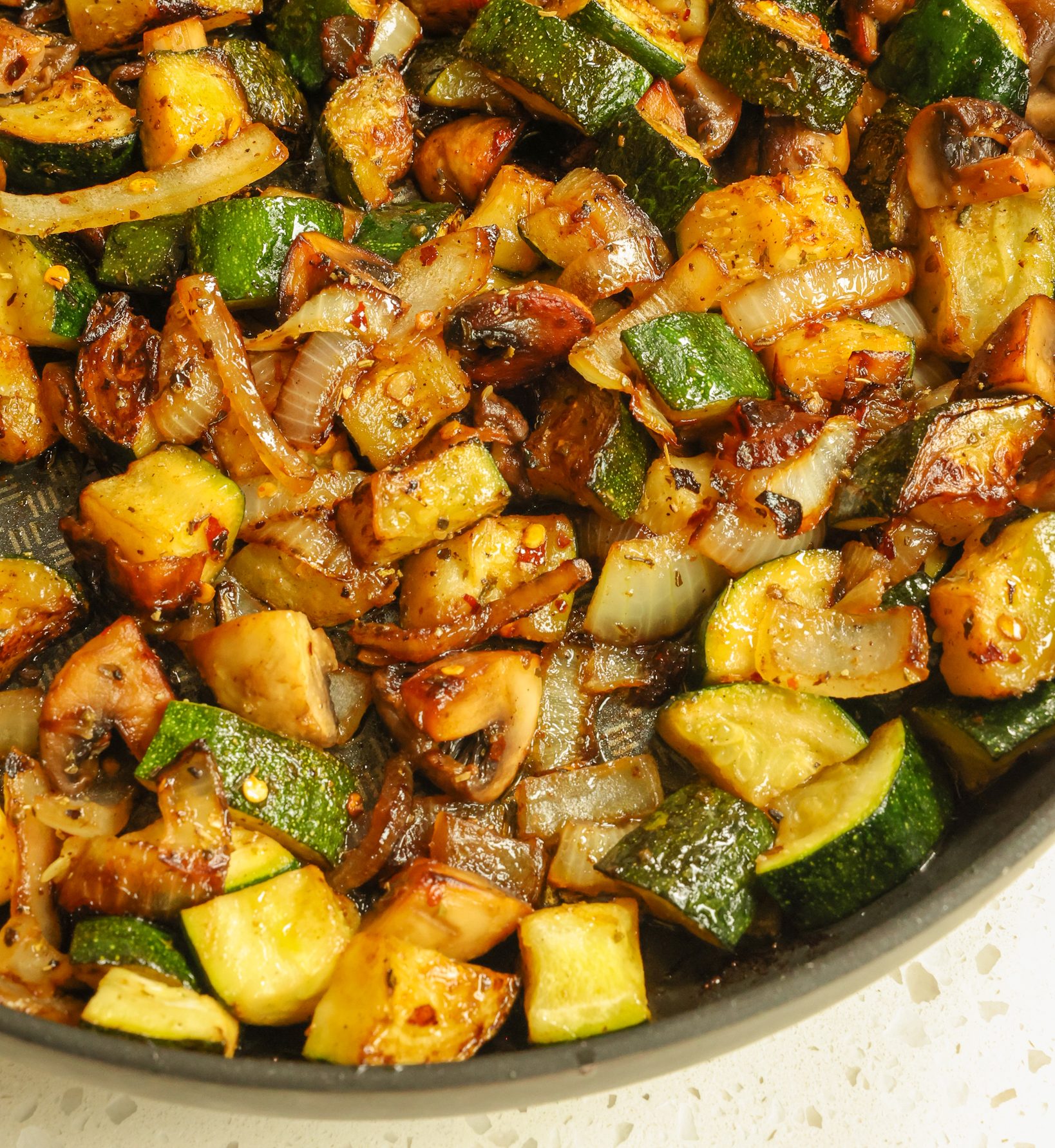 Geben Sie zunächst etwas Olivenöl und Butter in eine große Pfanne und erhitzen Sie sie bei mittlerer bis hoher Hitze. Geben Sie dann die Pilze und Zwiebeln hinzu und braten Sie das Gemüse an, bis es braun ist. Richten Sie das Gemüse auf einem Teller an und erhitzen Sie erneut etwas Olivenöl in der Pfanne bei mittlerer bis hoher Hitze. Geben Sie die Zucchini hinzu und verteilen Sie sie gleichmäßig darauf. Braten Sie sie unter mehrmaligem Wenden an, bis sie braun ist. Reduzieren Sie die Hitze und geben Sie Knoblauch, italienische Gewürze und rote Pfefferflocken hinzu und verrühren Sie alles gut. Nach Belieben etwas geriebenen Parmesan darüber streuen. Am besten servieren Sie das Gemüse sofort.