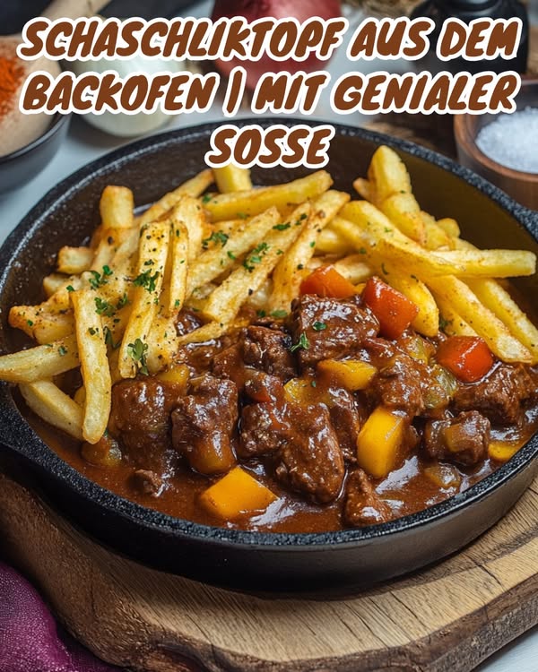 Würziger Schaschliktopf mit saftigem Fleisch und Paprika in Tomatensauce. Ein deftiges Familiengericht, das schnell zubereitet ist.