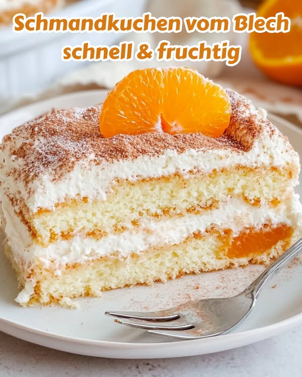 Cremiger Schmandkuchen mit Mandarinen vom Blech. Einfach zu backen und perfekt für jede Kaffeerunde.