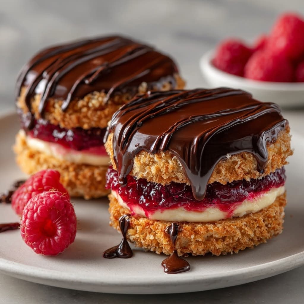 Schokoladenüberzogene Himbeer-Käsekuchen-Sandwiches