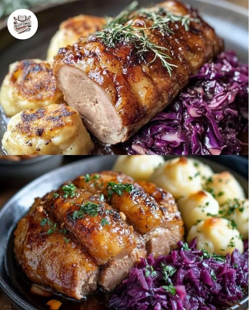 Schweinekrustenbraten mit Klößen und Rotkohl