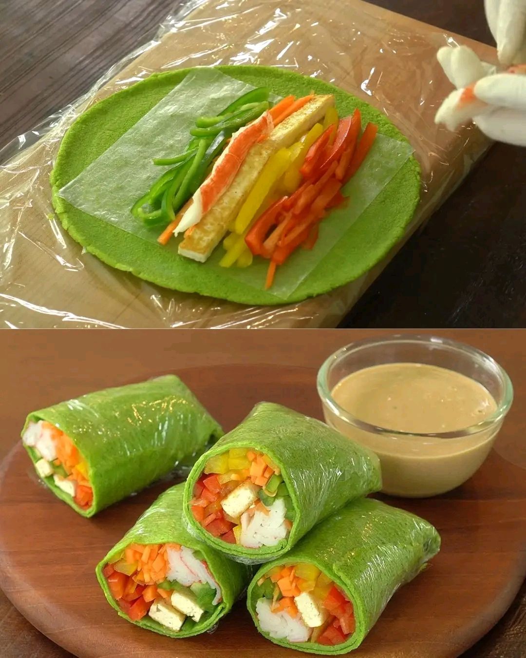 Diese Spinat-Tortilla-Wraps mit Erdnusssauce sind ein gesundes, herzhaftes und sättigendes Gericht mit einer bunten Mischung aus Gemüse, Tofu und einer köstlichen hausgemachten Erdnusssauce. Die Spinat-Tortilla verleiht dem Gericht einen erdigen, vollmundigen Geschmack, der das knackige, frische Gemüse perfekt ergänzt, während der goldbraun gebratene Tofu für einen proteinreichen Crunch sorgt. Die Erdnusssauce mit ihren süß-säuerlichen Noten rundet das Ganze zu einer geschmackvollen Harmonie ab. Diese Wraps sind nicht nur optisch ansprechend, sondern auch perfekt für ein schnelles Mittagessen, ein leichtes Abendessen oder sogar als Party-Vorspeise. Mit dem zusätzlichen Vorteil, dass Sie diese Wraps mit Ihren Lieblingsfüllungen individuell gestalten können, ist dieses Gericht eine wunderbare Möglichkeit, frische Zutaten auf gesunde und kreative Weise zu genießen.