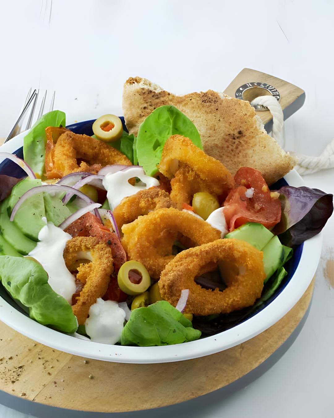Panierte Tintenfischringe mit Salat holen griechisches Urlaubsfeeling auf den Tisch. Schnell und einfach, nach 25 Minuten kann serviert werden.
