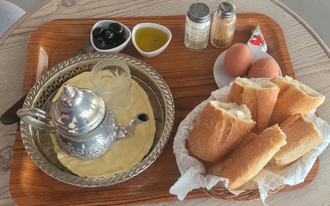 Dieses Frühstück auf dem Bild sieht nach einem klassischen nordafrikanischen oder mediterranen Frühstück aus. Hier ist ein einfaches Rezept, wie du so ein Frühstück selbst zubereiten kannst:
