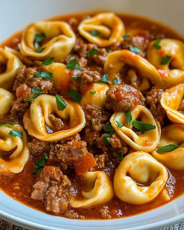 Saftige Rindfleischwürfel treffen auf Käse-Tortellini in cremiger Tomaten-Sahnesauce mit Parmesan und frischer Petersilie.