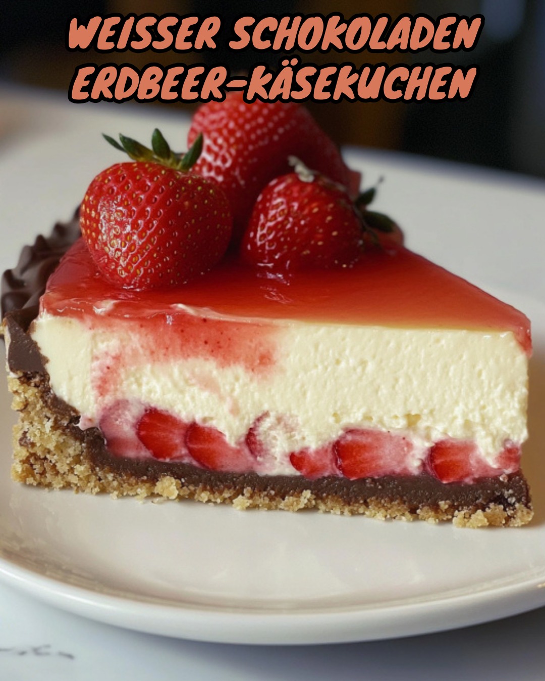 Gönnen Sie sich diesen himmlischen Käsekuchen mit einer knusprigen Keksbasis, einer cremigen weißen Schokoladenfüllung und einer frischen Erdbeernote!