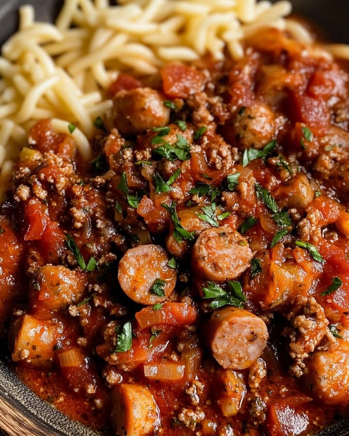 – 400 g Rinderbratwurst (ohne Haut, zerkrümelt)